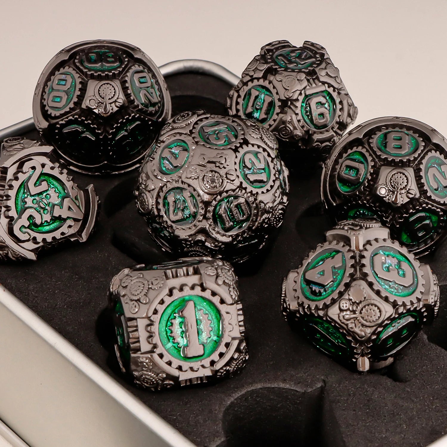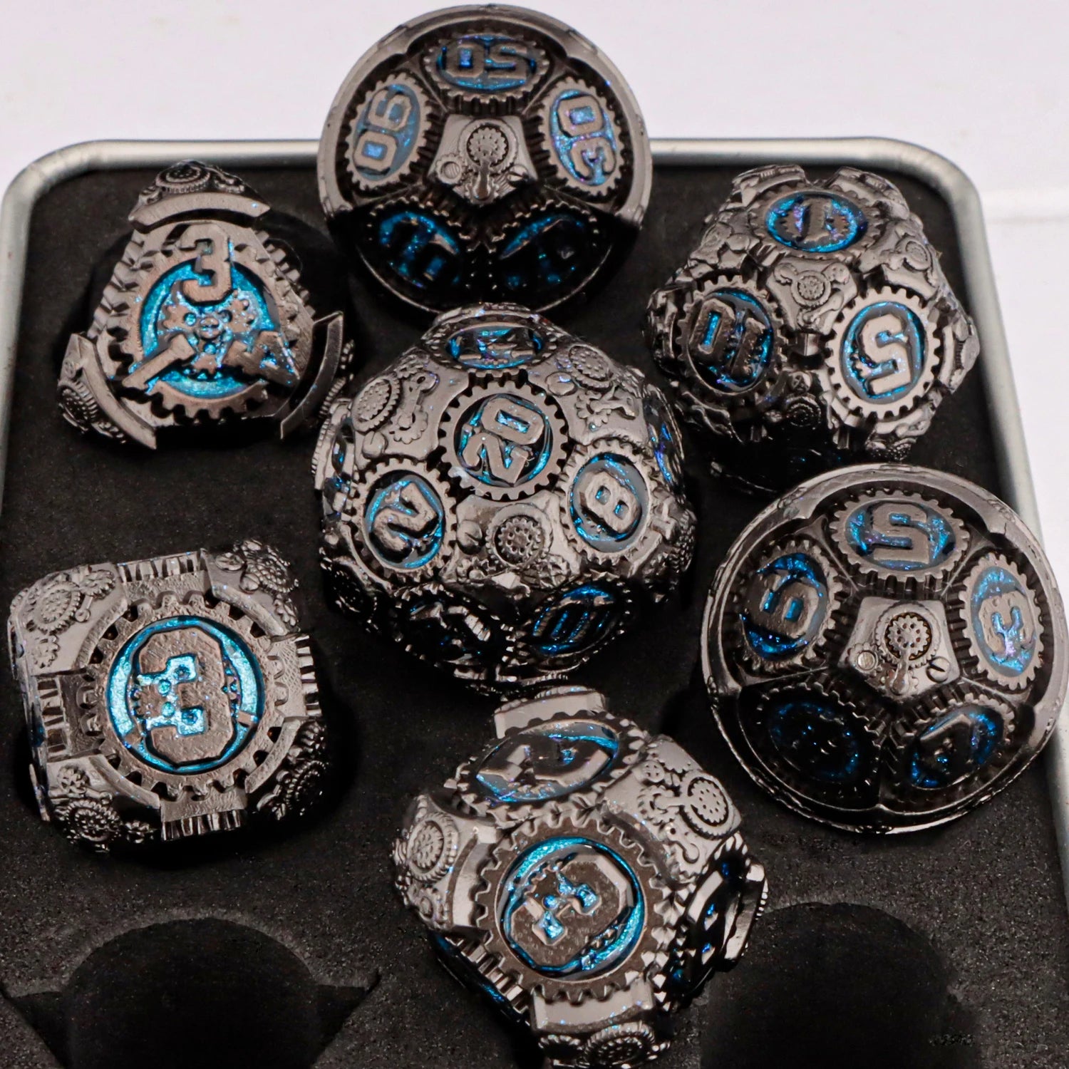 An arcane arsenal of metal-infused polyhedral sets, each inspired by sacred lore, gearbound prophecy, and spell-scarred memory. These dice carry names like Venomchant Reliquary, Chronocog Ledger, and Bloodgilt Remnant—a pantheon of relics forged for grimdark casters, war-engine tacticians, fae-touched witches, and steampunk strategists alike.