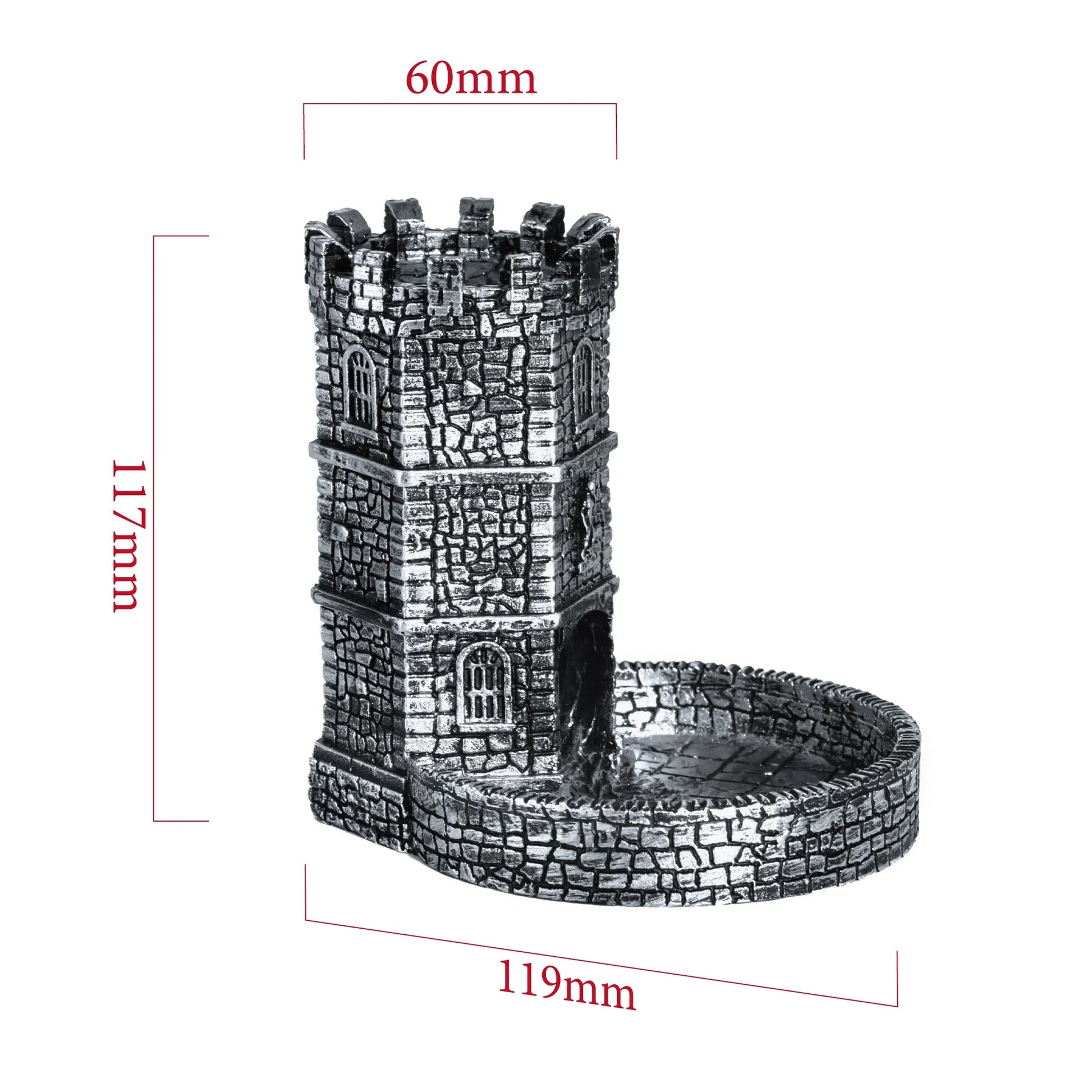Crafted from durable resin and textured with stonework detail, the tower features a hollow interior perfect for rolling most standard dice (d4–d12, d100). While d20s larger than 0.8" may not fit, smaller dice tumble through with satisfying precision.